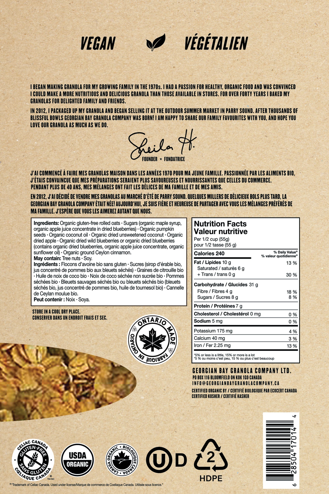 INGRÉDIENTS : FLOCONS D’AVOINE BIOLOGIQUE (BIO) ET SANS GLUTEN, SIROP D’ÉRABLE BIO, GRAINES DE CITROUILLE BIO, HUILE DE NOIX DE COCO BIO, NOIX DE COCO SÉCHÉE NON SUCRÉE BIO, POMMES SÉCHÉES BIO, BLEUETS SAUVAGES SÉCHÉS BIO OU BLEUETS SÉCHÉS BIO(CONTIENT DES BLEUETS SÉCHÉS BIO, JUS CONCENTRÉ DE POMMES BIO, HUILE DE TOURNESOL BIO), CANNELLE MOULUE BIO.